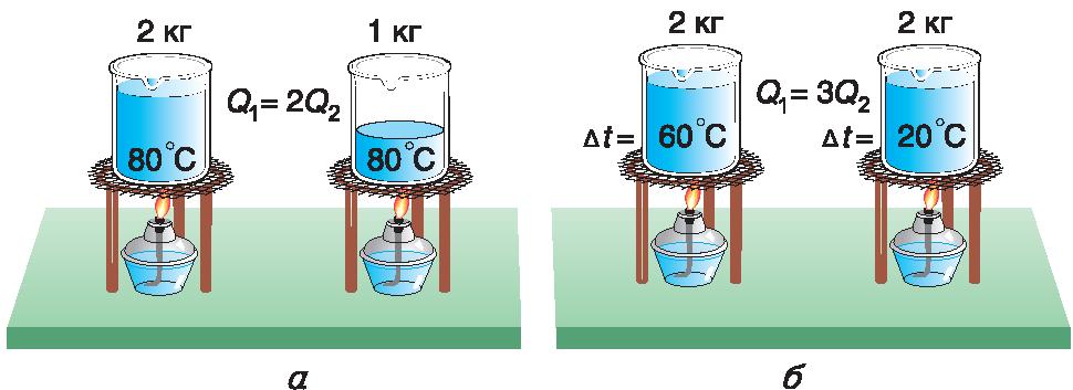 Внутренняя энергия тела есть суммарная энергия всех его частиц. Значит, если массу тела увеличить в два или три раза, то и количество теплоты, необходимое для его нагревания на одно и то же число градусов, увеличится в два или три раза (рис. 45, а). Например, на нагревание двух килограммов воды от 20 °С до 80 °С потребуется в два раза больше теплоты, чем на нагревание одного килограмма воды.