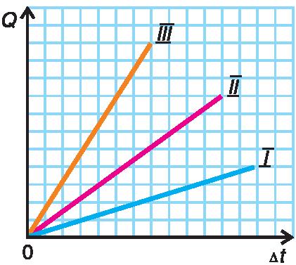 9На графиках I, II, III (рис. 48) даны зависимости количества теплоты от изменения температуры для трех тел одинаковой массы, но изготовленных из разных веществ. Сравните удельные теплоемкости веществ этих тел.