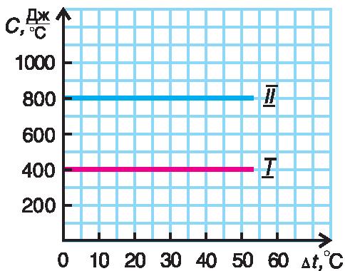 10На графиках I и II (рис. 49) изображены зависимости теплоемкостей двух тел от температуры. Определите количество теплоты, необходимое для нагревания этих тел на Из какого вещества изготовлены тела, если масса каждого из них Будут ли одинаковы теплоемкости разных тел, изготовленных из одного и того же вещества?