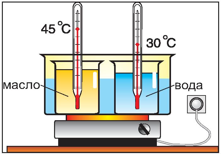 В два одинаковых металлических стакана нальем по 150 г подсолнечного масла и воды. Опустим в стаканы термометры и поставим на нагреватель (электроплитку или спиртовку (рис. 46). Получив за одинаковое время от нагревателя равное с водой количество теплоты, масло нагрелось больше, чем вода. Значит, для изменения Стр. 29температуры масла на одну и ту же величину требуется меньше теплоты, чем для такой же массы воды.